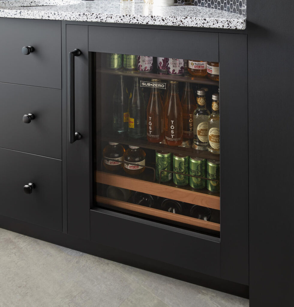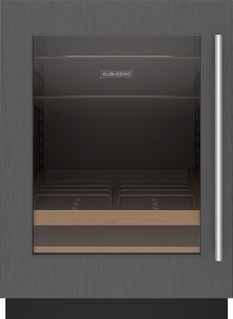 Unterbaukühlschrank mit Glastür, an der Ihre eigene Möbelblende oder Sub-Zero Edelstahl-Türblende mit Griff montiert werden kann.