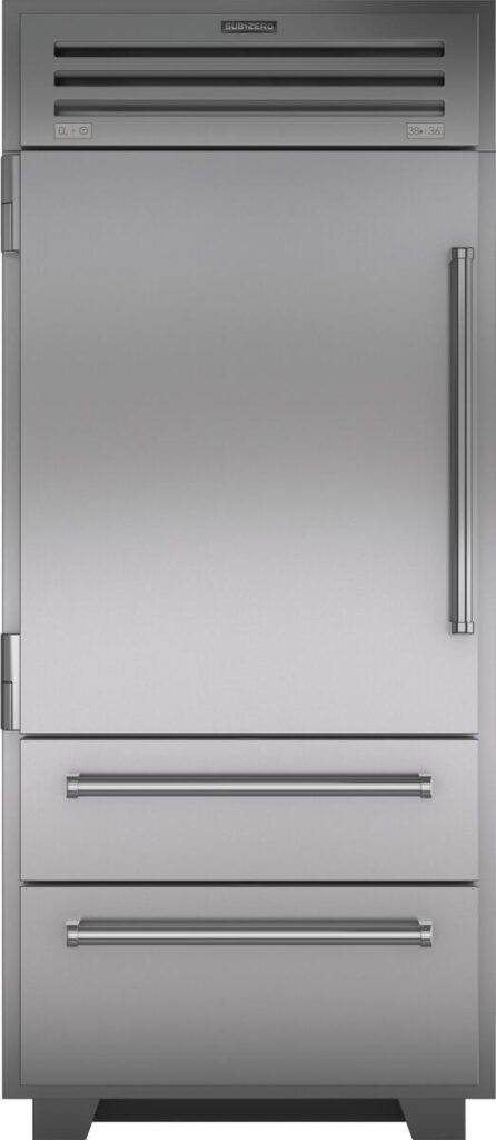 Dekorfähige Kühl-/Gefrierkombination. Auch in Edelstahlausführung erhältlich. Die Tür kann mit Anschlag links oder rechts geliefert werden. Mit Eiswürfelbereiter.