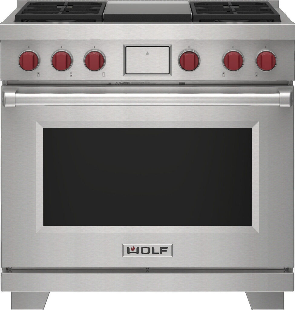Dual-Fuel-Herd von Wolf mit einer Breite von 91 cm und Einzelbackofen, vier Brennern und Teppanyaki-/Backfläche.