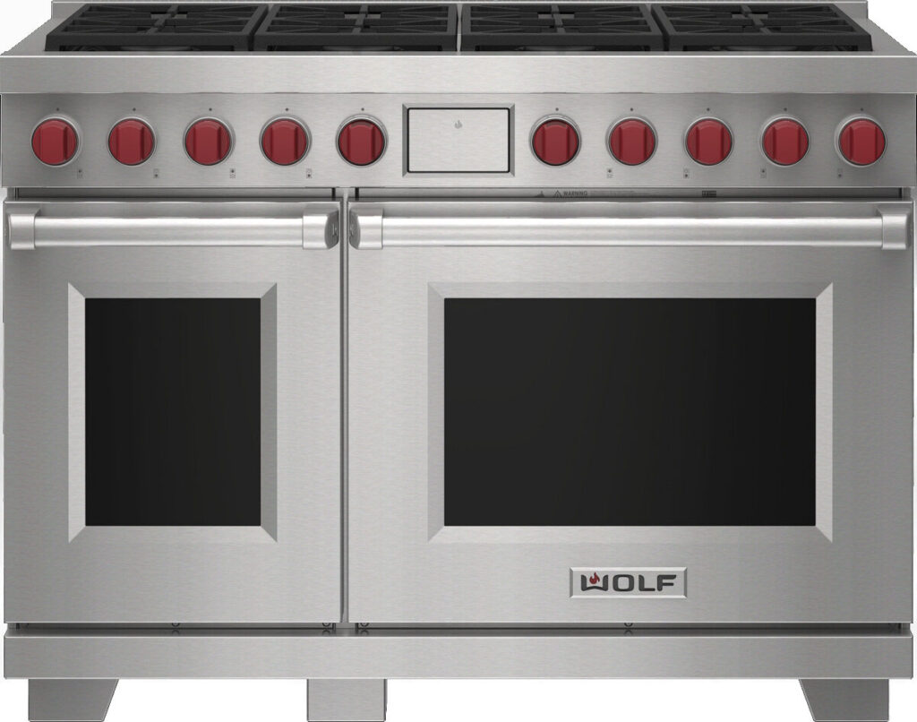 Dual-Fuel-Herd von Wolf mit einer Breite von 122 cm, Doppelbackofen und acht Brennern.