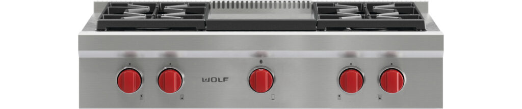 Separates Gaskochfeld von Wolf mit vier Brennern und Infrarot-Teppanyaki-/Backfläche, in 91 cm Breite im Transitional-Design.